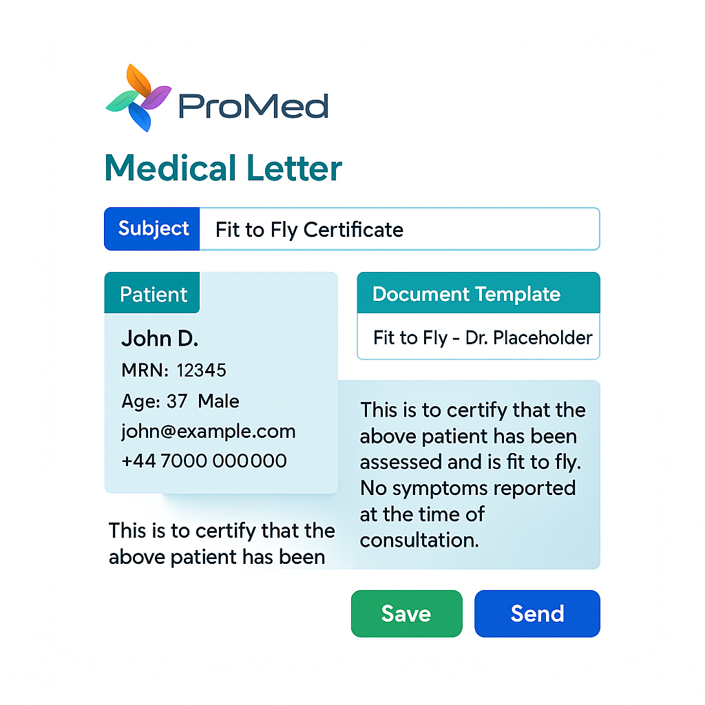 Easy Generation — Doctors can create letters instantly using ready-made templates, approve with a click, and send directly to the patient.