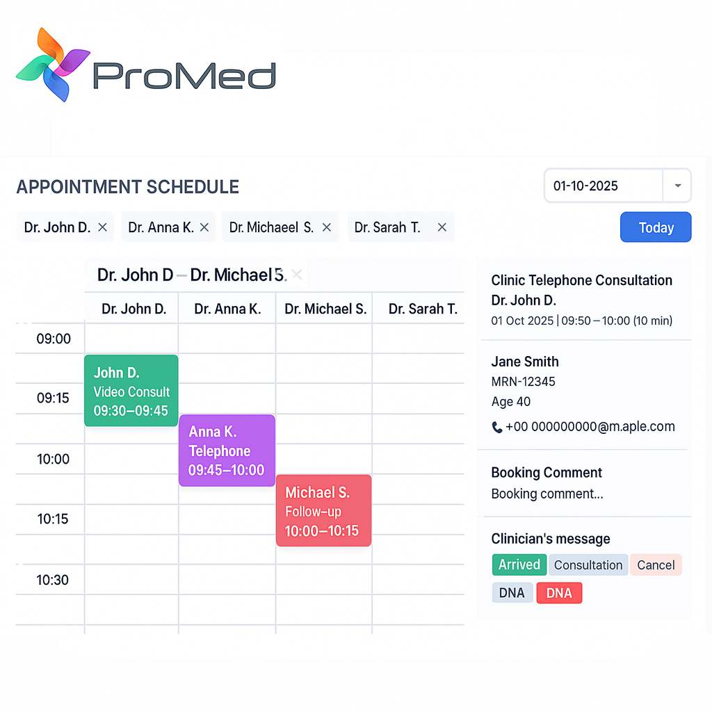 Manage every clinician’s schedule in real time. ProMed’s scheduling dashboard gives a clear view of appointments, statuses, and patient details — all in one screen.